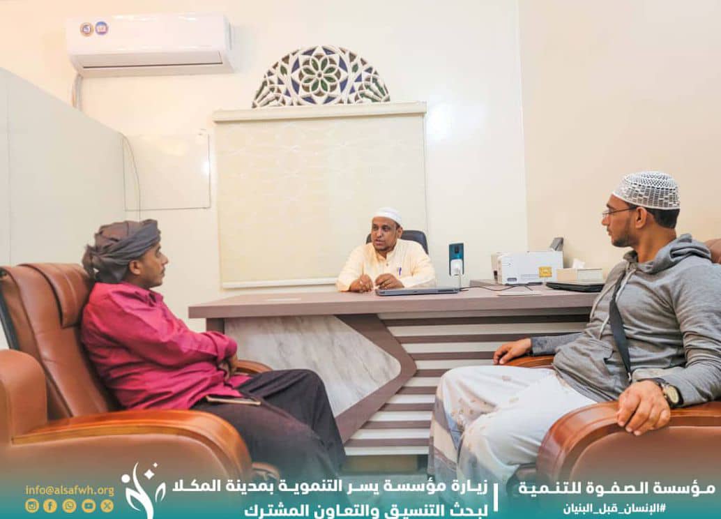 زار مسؤول الإعلام والعلاقات العامة بمؤسسة الصفوة للتنمية أحمد باضاوي، مؤسسة يسر للتنمية بمدينة المكلا - محافظة حضرموت، وكان في استقباله الأستاذ فواز باحمل، رئيس المؤسسة، وذلك لبحث مجالات التنسيق والتعاون المشترك بين الجانبين.
