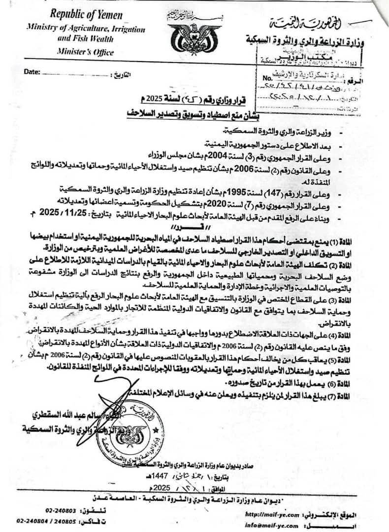 أصدر معالي وزير الزراعة والري والثروة السمكية، اللواء / سالم عبدالله السقطري اليوم، القرار الوزاري رقم (42) لسنة 2025م، القاضي بمنع اصطياد السلاحف البحرية والاتجار بها أو بتسويقها محلياً وخارجياً، في خطوة تستهدف حماية هذا الكائن البحري المهدد بالانقراض وتعزيز جهود الحفاظ على التنوع الحيوي في المياه اليمنية.