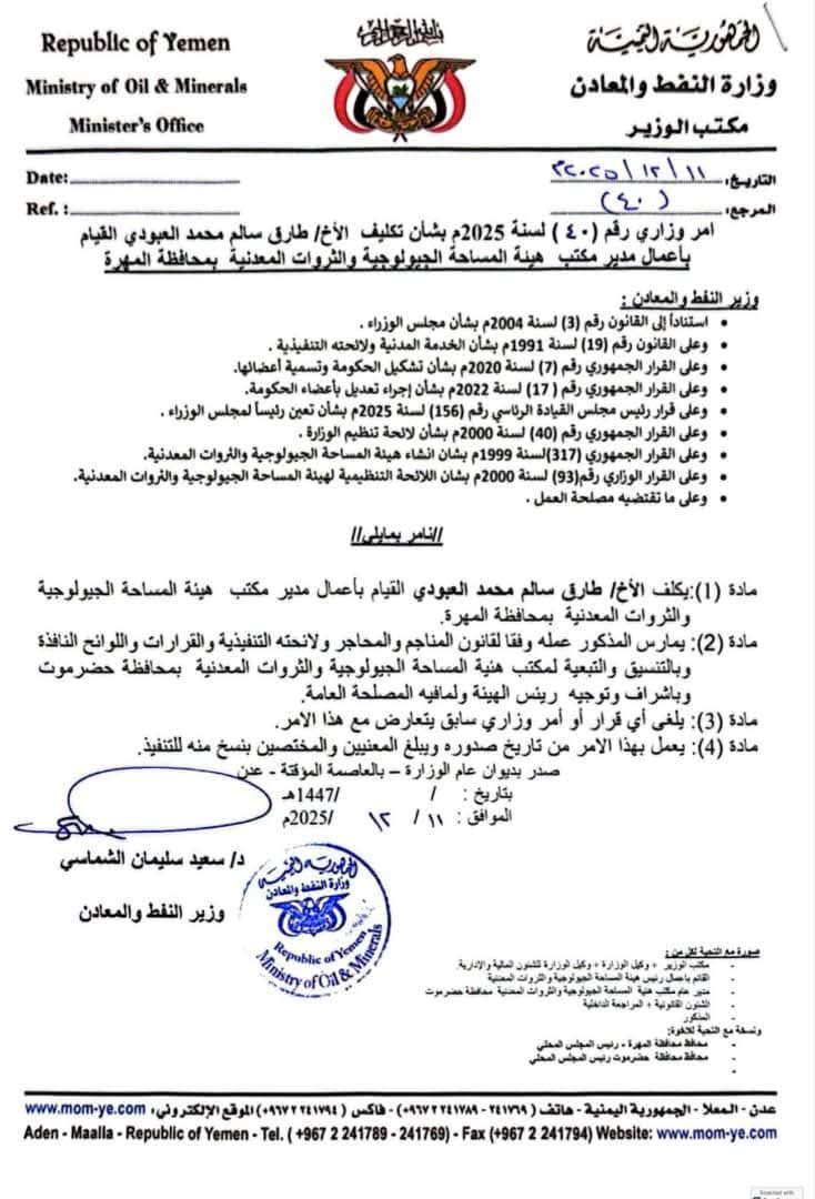 ويأتي هذا القرار استنادًا إلى القوانين واللوائح المنظمة لعمل الوزارة وهيئة المساحة الجيولوجية، وبما ينسجم مع متطلبات تطوير العمل الرقابي والفني في مجال الثروات المعدنية في محافظة المهرة.