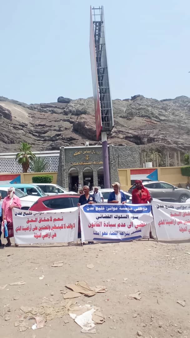 نظم عمال مؤسسة موانئ خليج عدن، صباح اليوم الاثنين، وقفة احتجاجية أمام محكمة الاستئناف في العاصمة عدن، استجابة لدعوة نقابتهم، للمطالبة بحقوقهم في الأراضي التعويضية، تزامناً مع انعقاد جلسة الشعبة المدنية الثانية يوم غد الثلاثاء للنظر في القضية.
