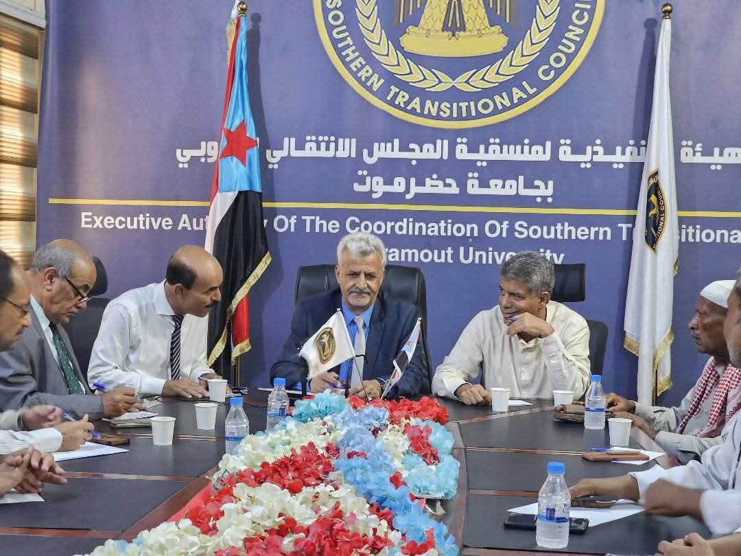 عقد فريق التوجيه والرقابة الرئاسي، برئاسة الدكتور عيدروس اليهري رئيس الفريق، عضو هيئة رئاسة المجلس الانتقالي الجنوبي، اليوم الأحد، لقاءً مع الهيئة التنفيذية لمنسقية المجلس الانتقالي الجنوبي في جامعة حضرموت.