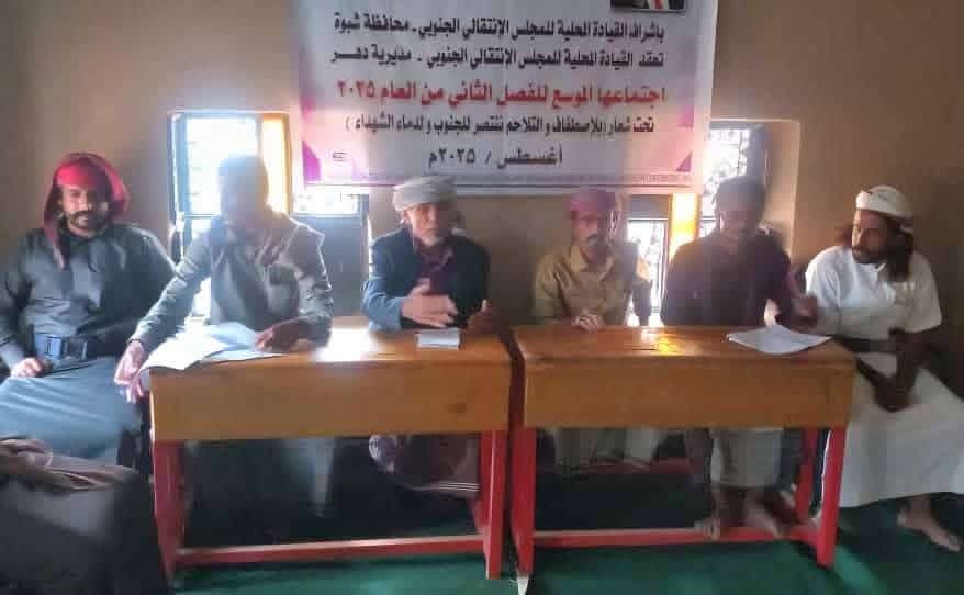 عقدت القيادة المحلية للمجلس الانتقالي الجنوبي في مديرية دهر بمحافظة شبوة، اليوم السبت، اجتماعها الموسع للفصل الثاني من العام الجاري، برئاسة مبارك عمر باثنية، رئيس الهيئة.