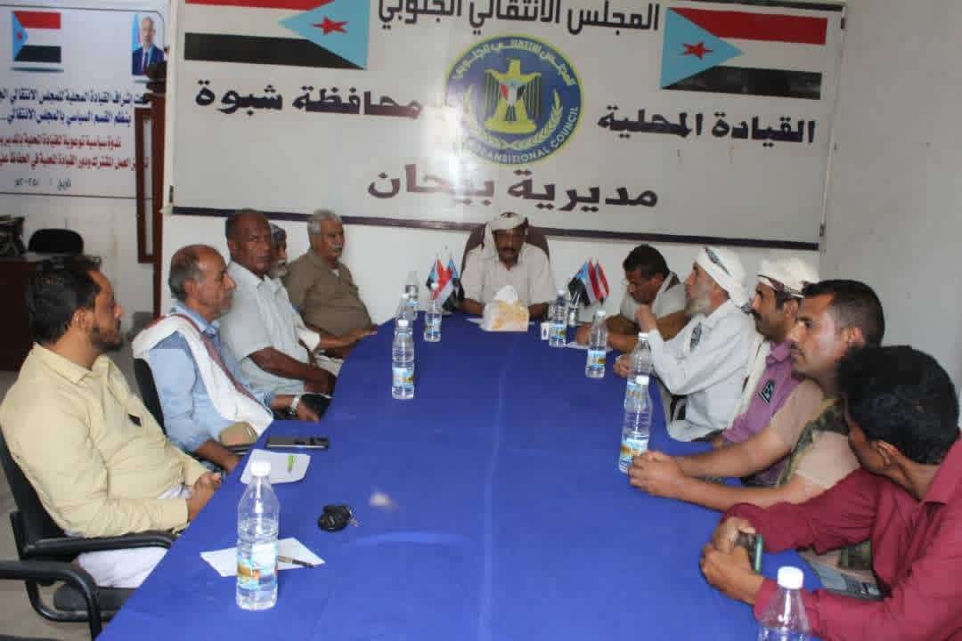 عقدت الهيئة التنفيذية للقيادة المحلية للمجلس الانتقالي الجنوبي في مديرية بيحان بمحافظة شبوة، اليوم الأحد، اجتماعًا استثنائياً، برئاسة الاستاذ أحمد محسن القربعي، رئيس الهيئة.