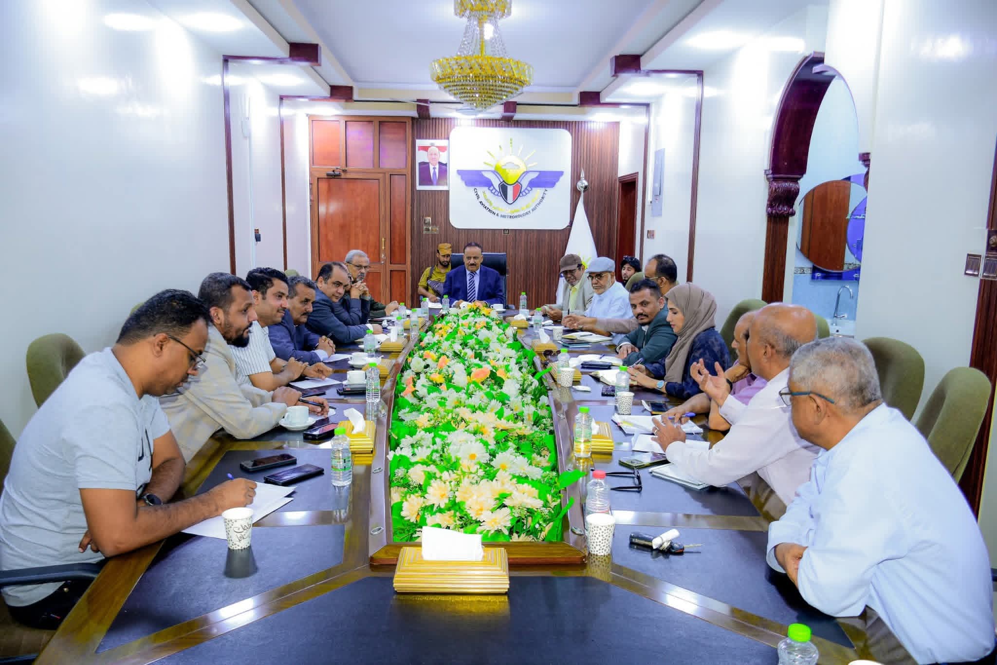 وتناول الاجتماع، الاستعدادات الجارية لتنفيذ مشروع مبنى الهيئة الجديد ومعهد الطيران ومبنى تدريب أمن الطيران في مطار عدن إلى جانب استعراض نتائج النزول الميداني للجنة الفنية إلى مطار سقطرى وما تم رفعه من احتياجات فنية لتأهيل المطار لاستقبال الرحلات الليلية إضافة إلى مناقشة اسباب اقرار البرنامج الوطني للطيران في مكتب دولة رئيس الوزراء وتبادل المقترحات والملاحظات المتصلة بهذا الشأن.