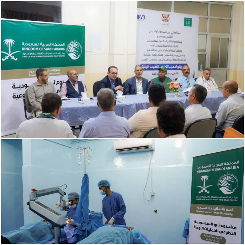 إطلع فريق مركز الملك سلمان للإغاثة والأعمال الإنسانية يوم أمس على سير الخدمات الصحية المقدمة للمستفيدين ضمن مشروع نور السعودية التطوعي لمكافحة العمى والأمراض المسببة له والمقام حاليا في محافظة تعز خلال الفترة (14) حتى (19) من سبتمبر 2025 م بالتنسيق مع وزارة الصحة العامة والسكان ويتم إجراء عمليات نوعية في القرنية بالإضافة الى عمليات جراحية بتقنيات حديثة لاستخراج المياه البيضاء.