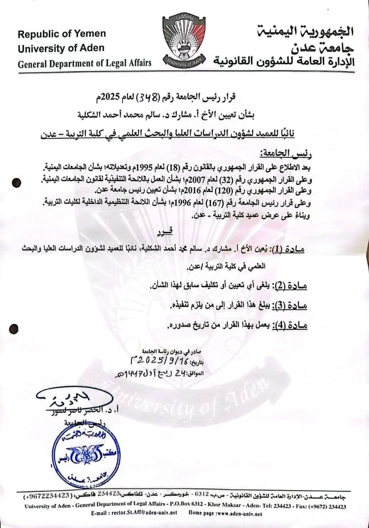 وجاء في سياق التهنئة " أتقدم بالتهاني والتبريكات إلى الزميل أ.مشارك .دكتور سالم محمد احمد الشكلية لنيله ثقة أ.د. الخضر ناصر لصور رئيس جامعة عدن بتعيينه نائباً للعميد لشؤون الدراسات العليا والبحث العلمي بكلية التربية عدن .