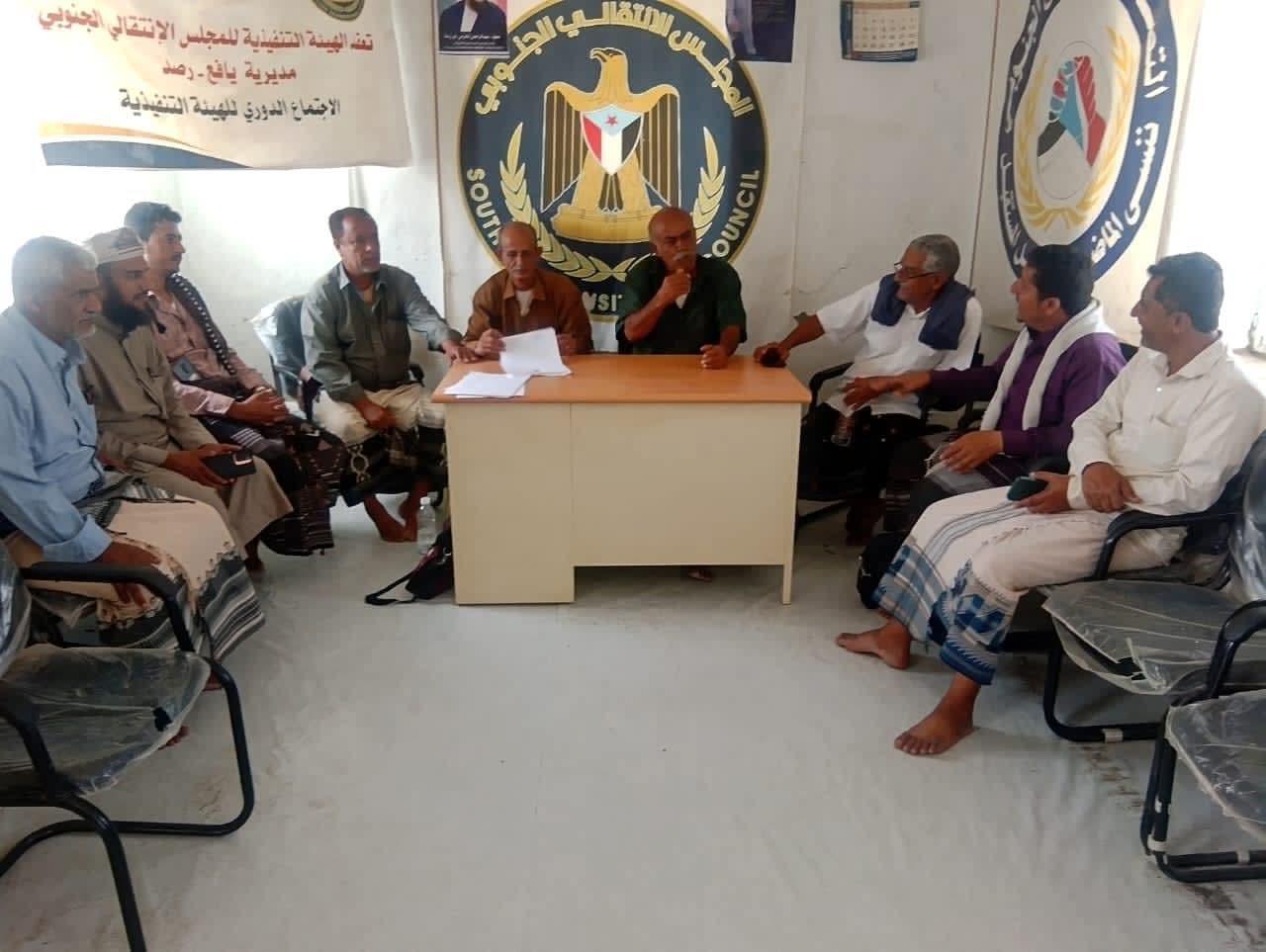 عقدت الهيئة التنفيذية للقيادة المحلية للمجلس الانتقالي الجنوبي في مديرية رصد يافع بمحافظة أبين، اليوم الثلاثاء، اجتماعها الدوري لشهر سبتمبر، برئاسة رئيس الهيئة الأستاذ أحمد عوض السعدي.