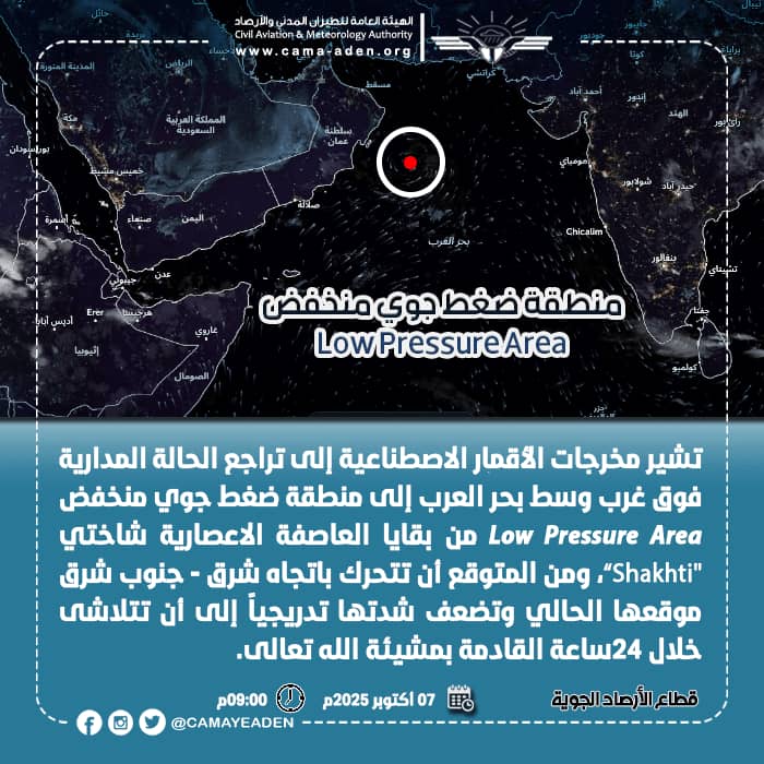 أفاد مركز التنبؤات الجوية والإنذار المبكر التابع للهيئة العامة للطيران المدني والأرصاد، بالعاصمة عدن، بتراجع الحالة المدارية فوق غرب وسط بحر العرب إلى منطقة ضغط جوي منخفض Low Pressure Area من بقايا العاصفة الاعصارية شاختي "Shakhti”، بحسب ما أشارت إليه مخرجات الأقمار الاصطناعية.