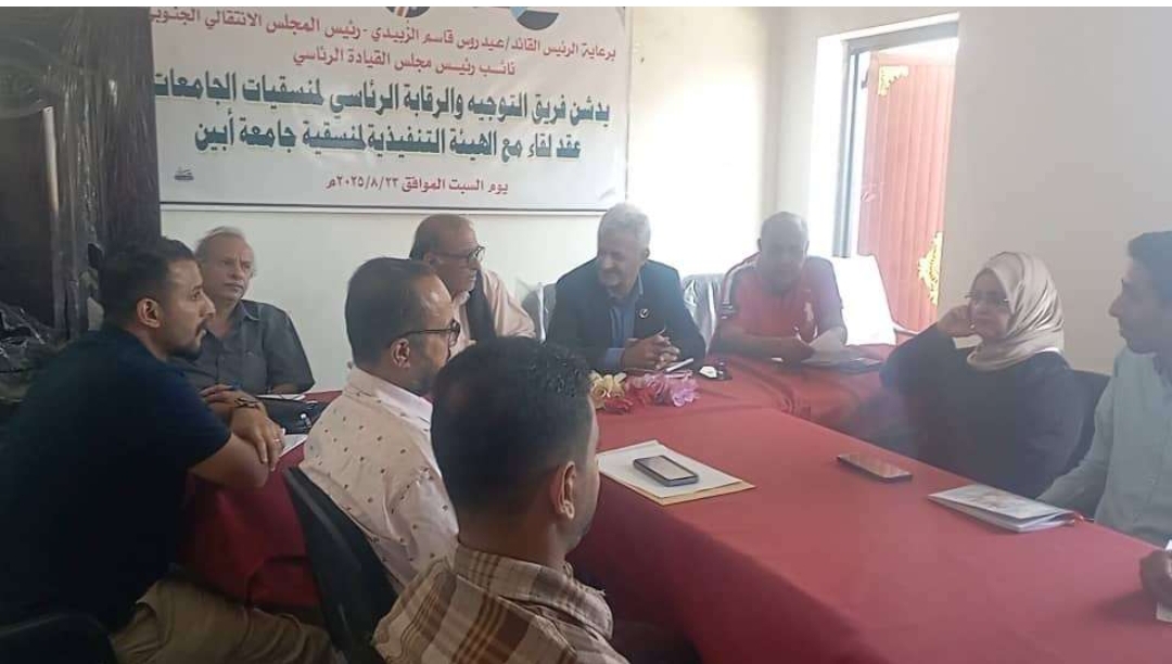 عقدت منسقية المجلس الانتقالي الجنوبي بجامعة أبين، يوم الخميس، اجتماعها الدوري لشهر أكتوبر 2025م، بحضور فريق التوجيه والرقابة الرئاسي برئاسة الدكتور عيدروس اليهري عضو هيئة رئاسة المجلس، رئيس الفريق.