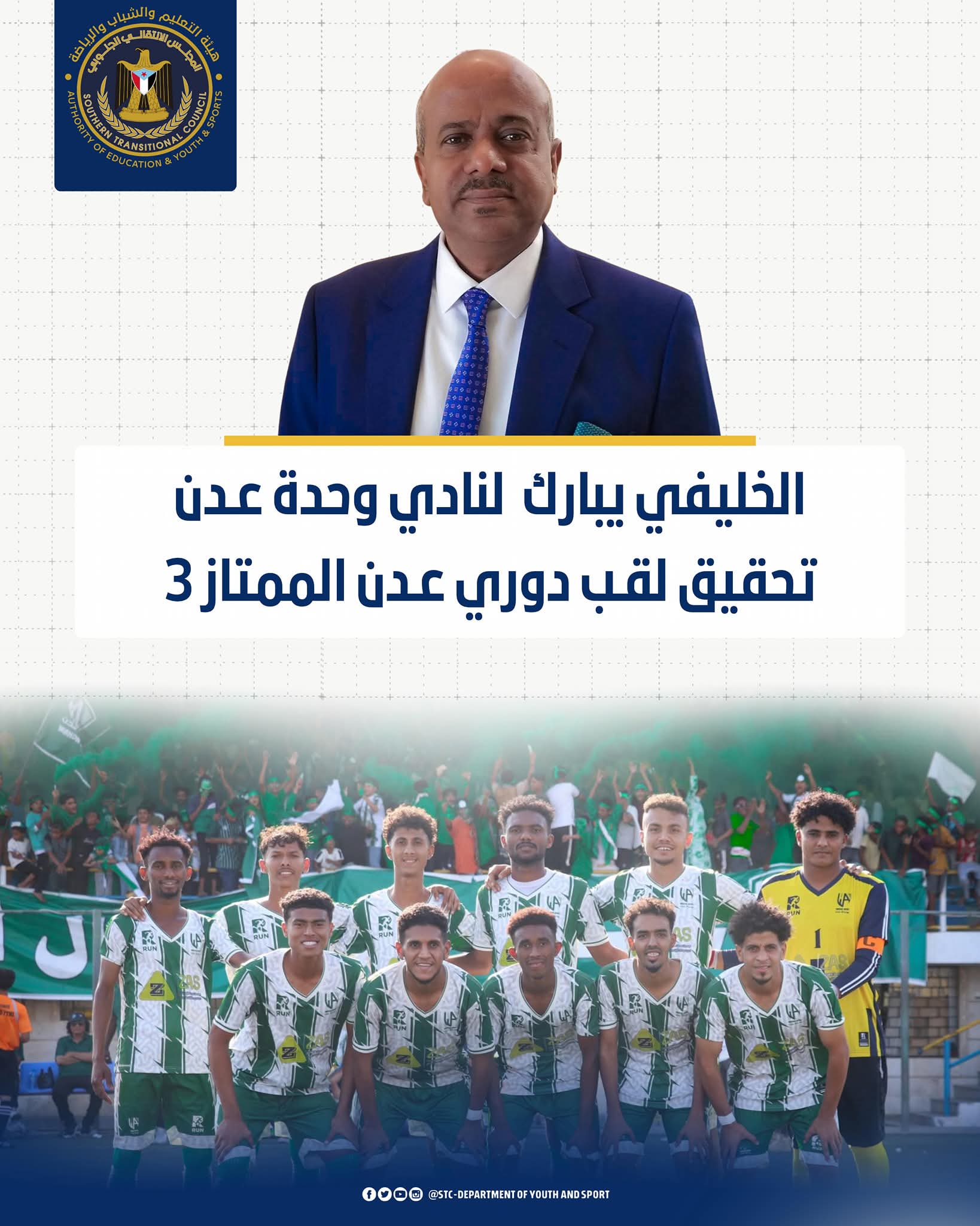 قدّم الأستاذ خالد الخليفي، رئيس هيئة التعليم والشباب والرياضة في المجلس الانتقالي الجنوبي، أسمى آيات التهاني والتبريكات إلى إدارة ولاعبي وجماهير نادي وحدة عدن بمناسبة تتويجهم المستحق ببطولة دوري عدن الممتاز لكرة القدم في نسختها الثالثة، عقب فوزهم يوم أمس السبت على فريق النصر بنتيجة (2–0) ضمن الجولة السابعة عشرة من البطولة.