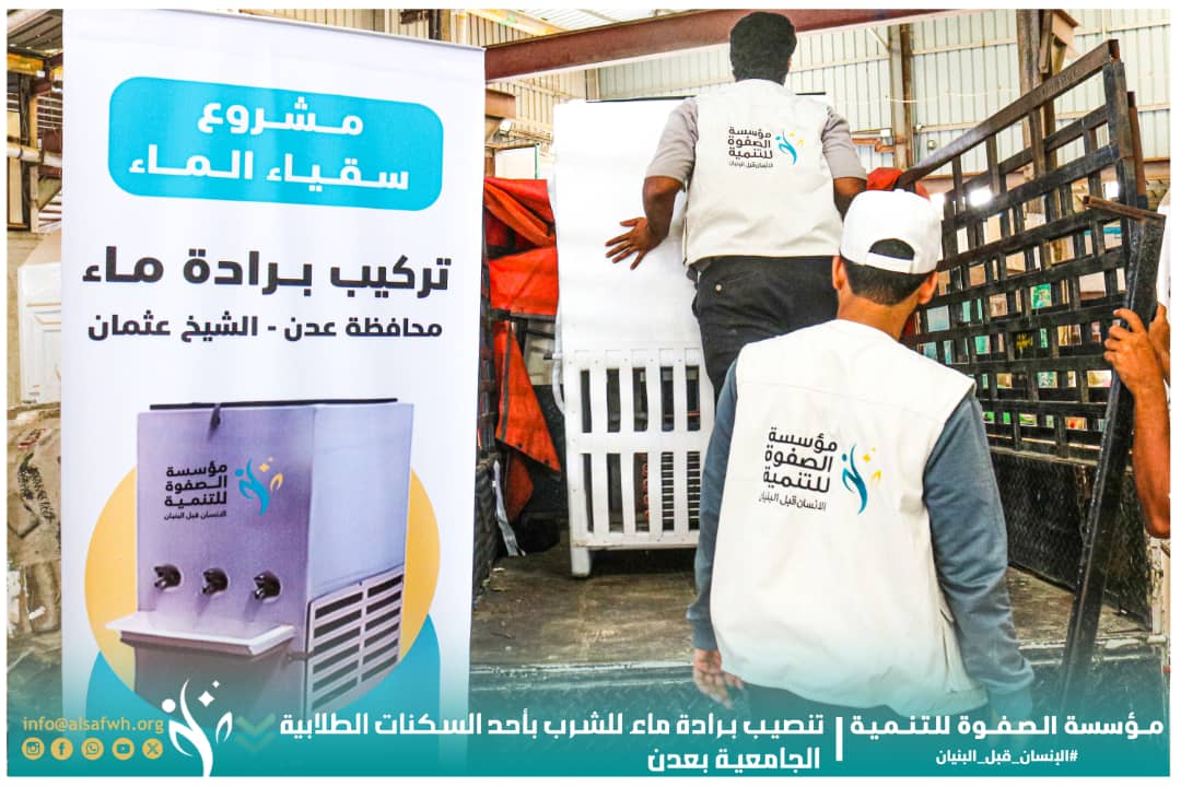 نفّذت مؤسسة الصفوة للتنمية، عملًا خيريًا جديدًا ضمن مشروع سقيا الماء، تمثّل في تركيب برادة مياه شرب بأحد السكنات الطلابية الجامعية في مديرية الشيخ عثمان بالعاصمة عدن، وذلك في إطار جهودها الإنسانية المستمرة لتوفير مصادر مياه نظيفة ومبردة في الأماكن ذات الحاجة.