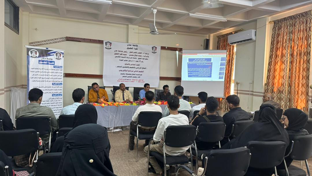 ضمن مساعيها لتحقيق متطلبات الاعتماد الأكاديمي وتطبيق معاييره الحديثة، نظمت كلية الحقوق بجامعة عدن صباح اليوم الأحد 16 نوفمبر، ورشة علمية تدريبية بعنوان: “المنهج الدراسي وهيئة التدريس كمعيارين للاعتماد الأكاديمي وضمان الجودة”، وذلك برعاية كريمة من رئيس الجامعة الأستاذ الدكتور/الخضر ناصر لصور، وإشراف مباشر من عميد الكلية أ.مشارك د/محمد صالح محسن.