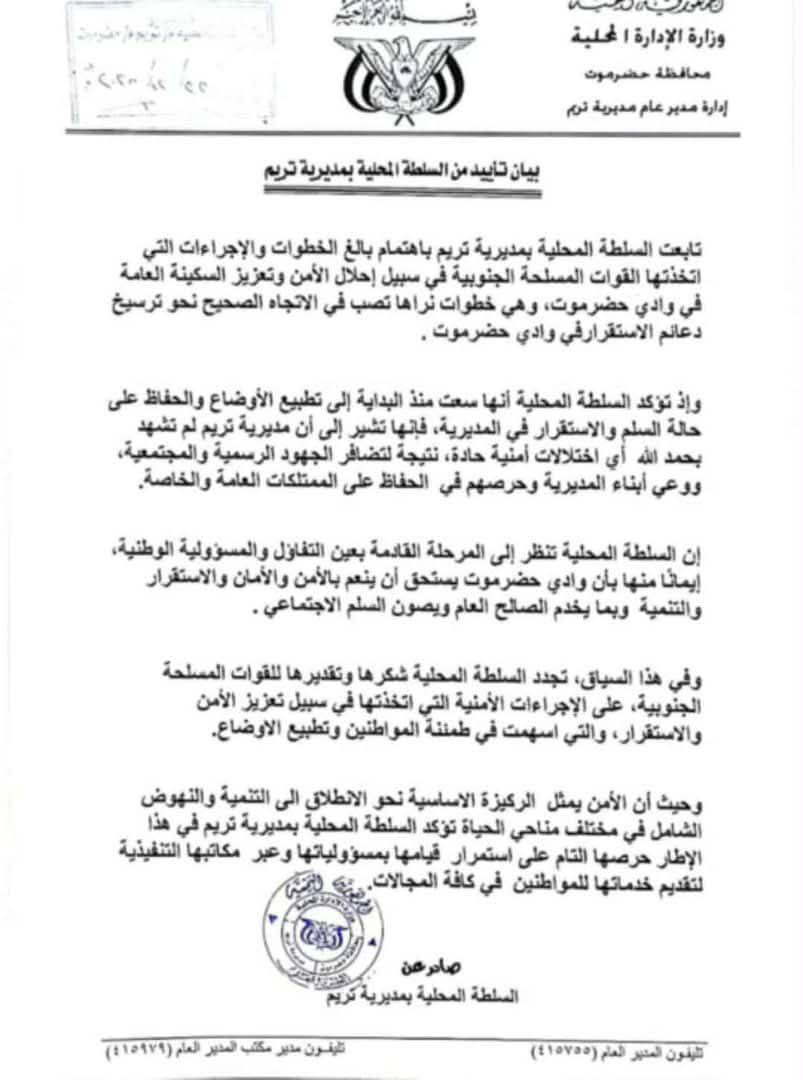 السلطة المحلية بمديرية تريم تصدر بيان تأييد للخطوات الأمنية بوادي حضرموت