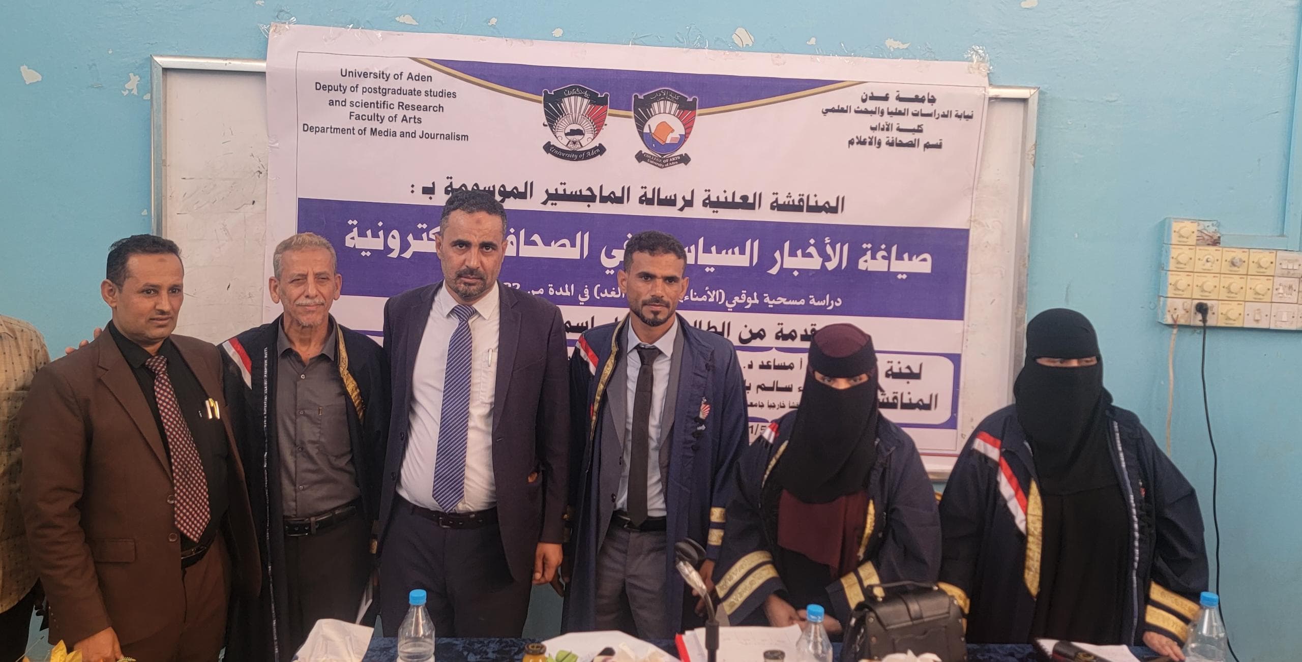 "صياغة الأخبار السياسية في الصحافة الإلكترونية: دراسة مسحية لموقعي الأمناء وعدن الغد خلال المدة من 2020–2022م"، حيث تناولت بالدراسة والتحليل أساليب صياغة الأخبار السياسية في الصحافة الإلكترونية، مع التركيز على القوالب الصحفية المستخدمة، وطرق التحرير، وأدوات الصياغة الحديثة التي تعتمدها المواقع الإخبارية الإلكترونية، في ظل التحولات الرقمية المتسارعة.