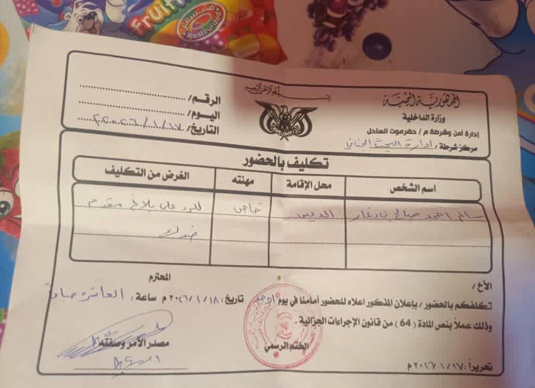 وقد تعرّض الزميل بن دغار لعمليات تخويف وابتزاز ومطاردة ممنهجة، ما اضطره إلى الاختفاء القسري منذ يوم الخميس الماضي وحتى اليوم، حفاظًا على سلامته. وفي تصعيد خطير، أقدمت إدارة البحث الجنائي بساحل حضرموت على إرسال استدعاء كيدي له، دون توضيح أسباب الاستدعاء أو الجهة التي تقف خلفه، في محاولة مكشوفة لترهيبه وإسكاته.