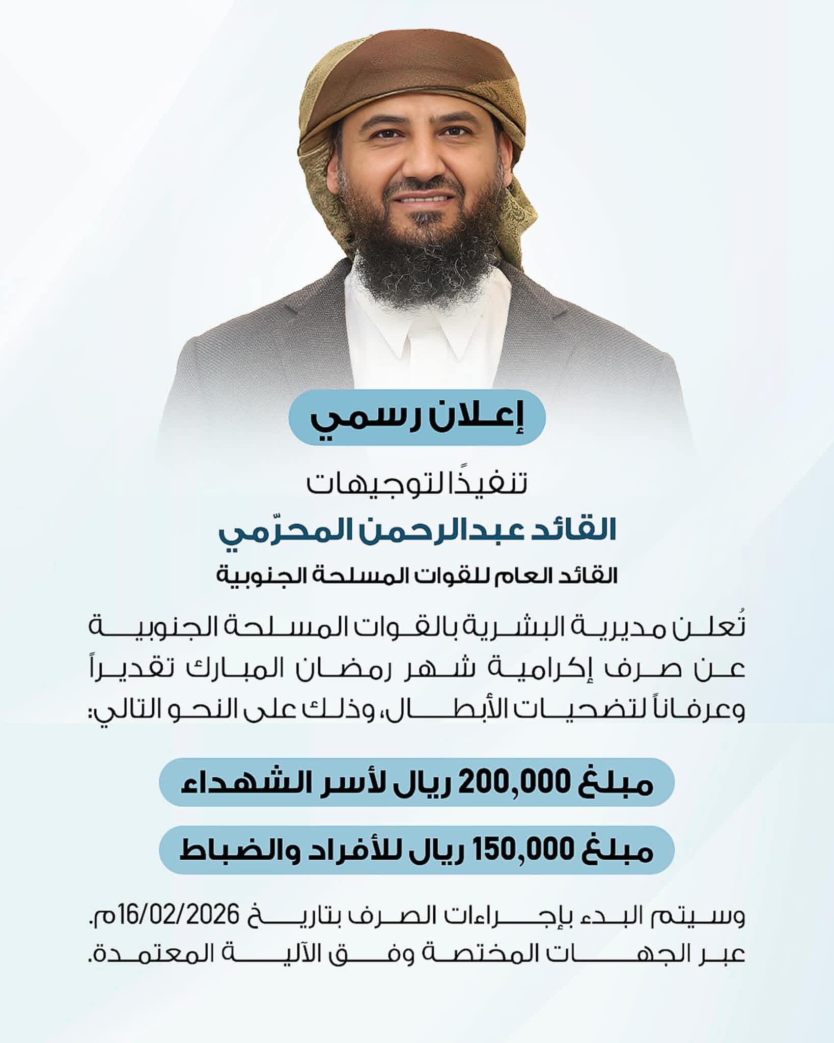 تنفيذاً لتوجيهات القائد عبدالرحمن المحرّمي، القائد العام للقوات المسلحة الجنوبية.. أعلنت مديرية البشرية العامة بالقوات المسلحة الجنوبية، عن صرف إكرامية شهر رمضان المبارك تقديراً وعرفاناً لتضحيات أبطال القوات المسلحة الجنوبية. وأوضحت المديرية البشرية العامة بالقوات الجنوبية، في بيان الإعلان، أن الإكرامية تشمل صرف مبلغ (200,000) ريال لأسر الشهداء، ومبلغ (150,000) ريال للأفراد والضباط، وذلك في إطار اهتمام القيادة برعاية أسر الشهداء ودعم منتسبي القوات المسلحة. وأكدت أن هذه المبادرة تأتي وفاءً للتضحيات الجسيمة التي قدمها الشهداء والأبطال في سبيل الدفاع عن الوطن وصون مكتسباته، وتجسيداً لحرص القيادة على مساندة منتسبي القوات المسلحة الجنوبية وأسرهم، لا سيما خلال شهر رمضان المبارك. وبيّنت مديرية البشرية العامة أن إجراءات الصرف ستبدأ اعتباراً من تاريخ 16 فبراير 2026م، عبر الجهات المختصة ووفق الآلية المعتمدة. واختتمت "سائلةً الله تعالى أن يتقبل الشهداء بواسع رحمته، وأن يحفظ أبطال القوات المسلحة الجنوبية، ويديم على الوطن نعمة الأمن والاستقرار".