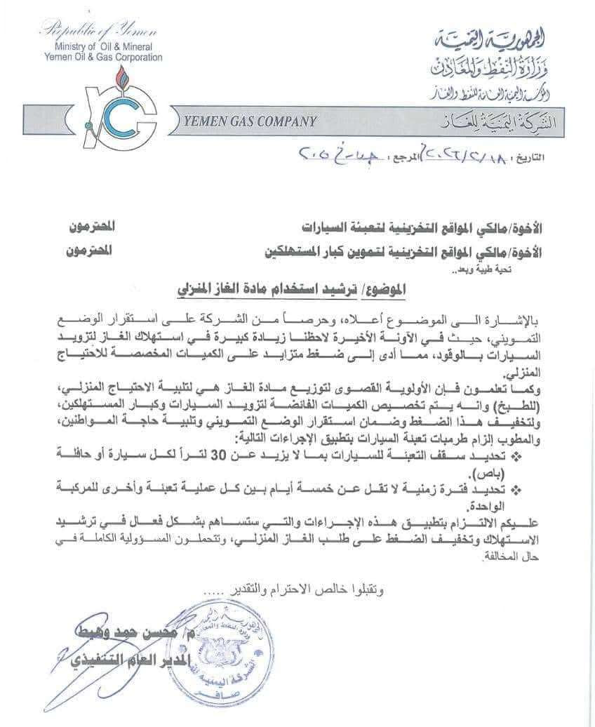 لافتةً إلى أن الأولوية القصوى في توزيع مادة الغاز مخصصة لتغطية الاحتياج المنزلي لأغراض الطهي، وأن "الكميات الفائضة فقط هي التي يتم توجيهها لتزويد السيارات وكبار المستهلكين"، وفق التعميم.
