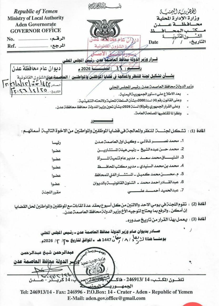 أصدر وزير الدولة محافظ العاصمة عدن الأستاذ عبدالرحمن شيخ، اليوم الأربعاء، قراراً قضت مادته الأولى بتشكيل لجنة للنظر والمعالجة في قضايا الموظفين والمواطنين بديوان عام محافظة عدن، برئاسة وكيل أول محافظة عدن محمد نصر شاذلي، وعضوية كل من: رئيس هيئة المستشارين محمد حسن عبده الشيخ، ومدير عام تنمية الموارد اشتياق محمد سعد، ومدير مكتب المحافظ محمد بن محمد السنباني، والمستشار الفني للمحافظ م. محسن محمد كعبيل ومدير الشؤون القانونية بالديوان عبدالقادر أحمد محمد، فيما كُلّف عبدالحميد أحمد علي مقرراً للجنة.