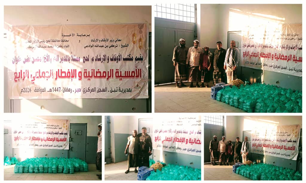 تواصلاً لبرنامجه السنوي الذي اعتاد عليه في كل عام، وبرعاية كريمة من معالي وزير الأوقاف والإرشاد الشيخ تركي بن عبد الله الوادعي ومحافظ محافظة لحج اللواء الركن أحمد عبد الله تركي، وبإشراف مباشر من مدير عام مكتب الوزارة بلحج الأستاذ محسن بن فضل علوان الشعبي، نظم عصر يوم السبت مكتب الأوقاف والإرشاد بالمحافظة أمسيته الرمضانية التوعوية الإرشادية ومأدبة الإفطار الجماعية لنزلاء الإصلاحية المركزية بمدينة صبر مديرية تبن.